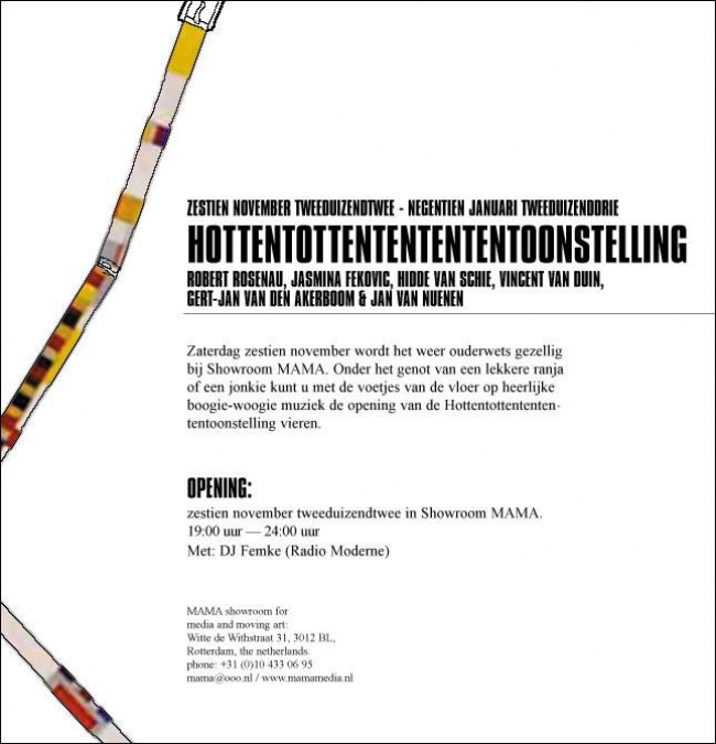 Andere kunstenaars die een video presenteren zijn Jasmina Fekovic en Vincent van Duin. Fekovic maakte de video 'Hottentottententententoonstelling', een video over Anton Heyboer in zijn woonomgeving. Van Duin maakte de video 'Milano! Milano! Milano!'. Hierbij zette hij zijn camera op een statief en liet de mensen die voorbij liepen zijn video maken.