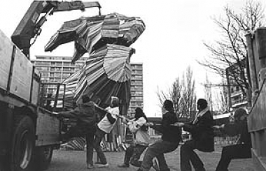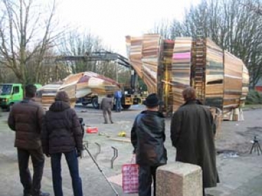 10 meter hoog van hout: 'De Reus van Vlaardingen'.Projectleider en kunstenaar Florentijn Hofman heeft een achtergrond als beeldhouwer en is een ervaren begeleider van kunst-educatieve trajecten.De MAMA-dependance op de Strip werd een houtwerkplaats.