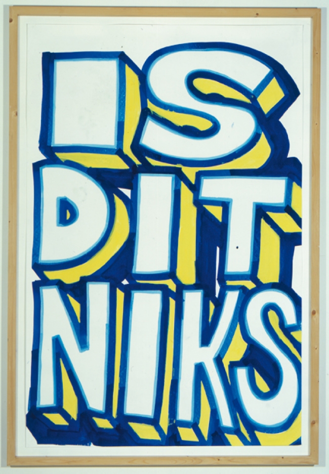 Het heeft allemaal met elkaar te maken. Mensen vinden zoiets grappig op een openbaar toilet, maar als je het in een kamer op een muur schrijft, raken ze in de war, dat vinden ze niet in de haak, omdat ze vaststaande ideeën hebben over waar je zo'n boodschap zou moeten lezen. Maar er stond 'Ja' en als er 'Nee' had gestaan, had ik doorgelopen met mijn vaststaande ideeën over kunst en kunstenaars, dat ze een beetje 'ja ja, whatever' zijn?