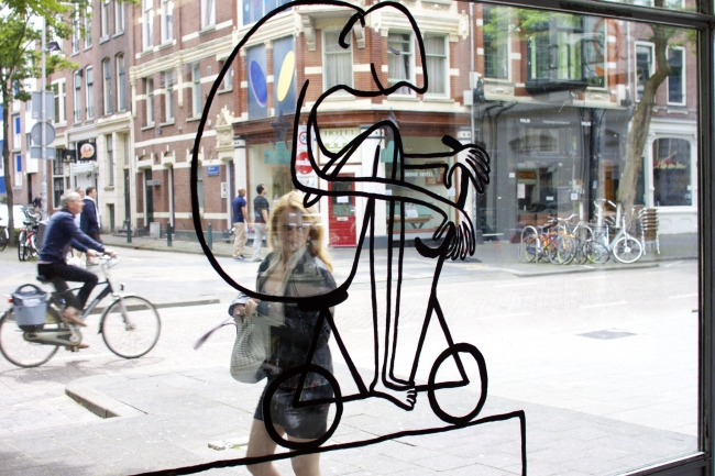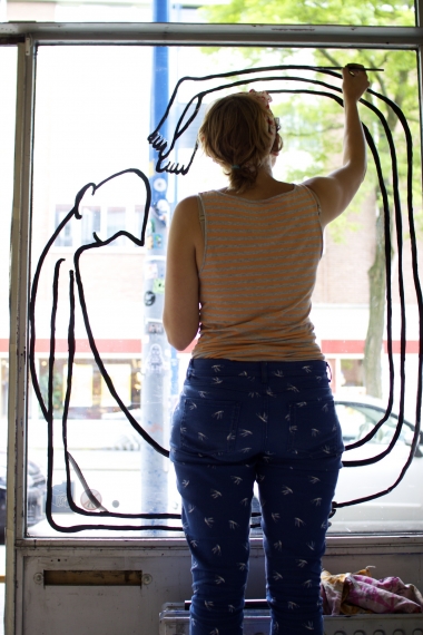 Silvie Buenen is derdejaars studente illustratie aan AKV Sint Joost. In haar tekeningen staan mensfiguren centraal. Silvie tekent haar figuren altijd vanuit de losse pols en maakt nooit schetsen. Door haar spontane werkwijze lijken haar figuren altijd in beweging te zijn. Voor dit Raamproject zal ze de uitdaging aangaan om op groot vlak te werken en zal ze de verf direct op het raamoppervlak aanbrengen, waardoor er slechts één kans is om de mensfiguren te creëren.