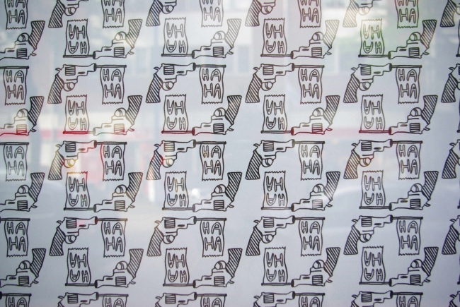 Boris de Vries, beter bekend als Father Futureback, is grafisch ontwerper en wordt in zijn werk sterk beïnvloedt door de skateboard-, metal- en punkcultuur. In het dagelijks leven ontwerpt hij tattoos, maakt hij illustraties en collages en is hij tevens frontman van de band Adolf Butler. Voor dit Raamproject heeft hij de typische elementen uit slapstick films, zoals bananen en taarten tot een patroon verwerkt.