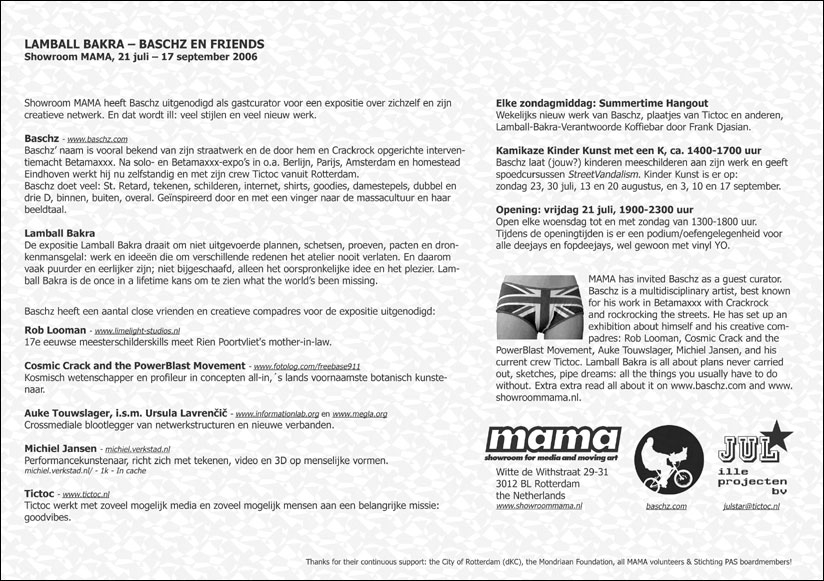 De expositie Lamball Bakra draait om niet uitgevoerde plannen, schetsen, proeven, pacten en dronkenmansgelal: werk en ideeën die om verschillende redenen het atelier nooit verlaten. En daarom vaak puurder en eerlijker zijn dan het werk dat je wel mag zien! Niet bijgeschaafd, geen compromissen, alleen het oorspronkelijke idee en het plezier. Lamball Bakra is de once in a lifetime kans om te zien what the world's been missing.