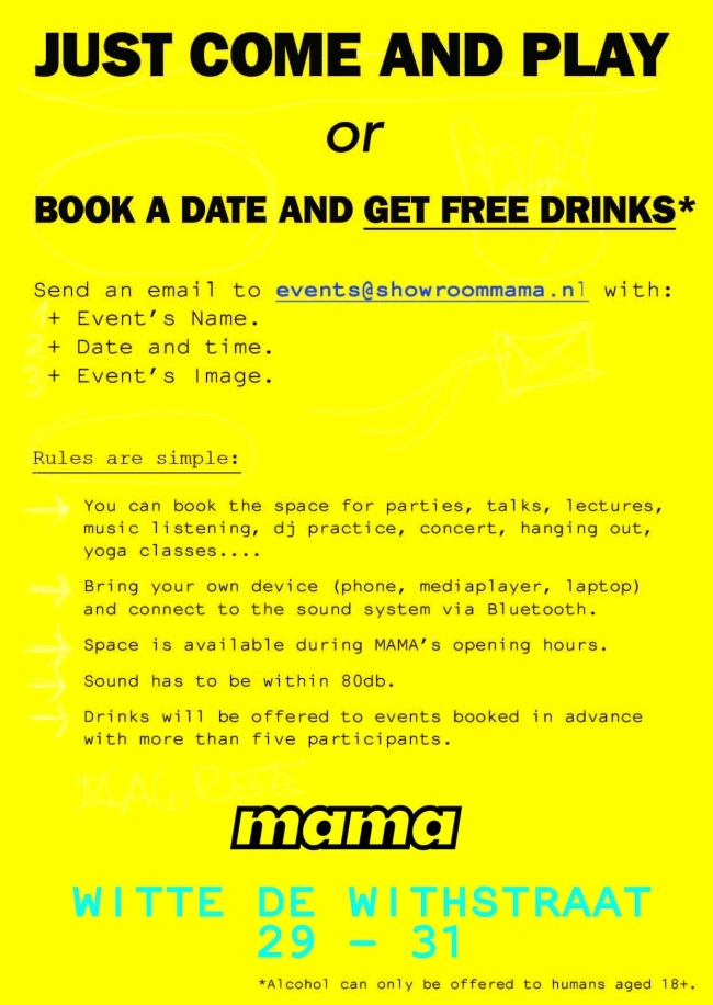 Je kunt de ruimte boeken voor feesten, lezingen, workshops, het luisteren van muziek, het oefenen van je dj kunsten, concerten, yoga lessen etc. Stuur een mail naar events@showroommama.nl met de naam van het evenement, evenementafbeelding, datum en tijd om de ruimte te reserveren. Nog open tot 2 april.